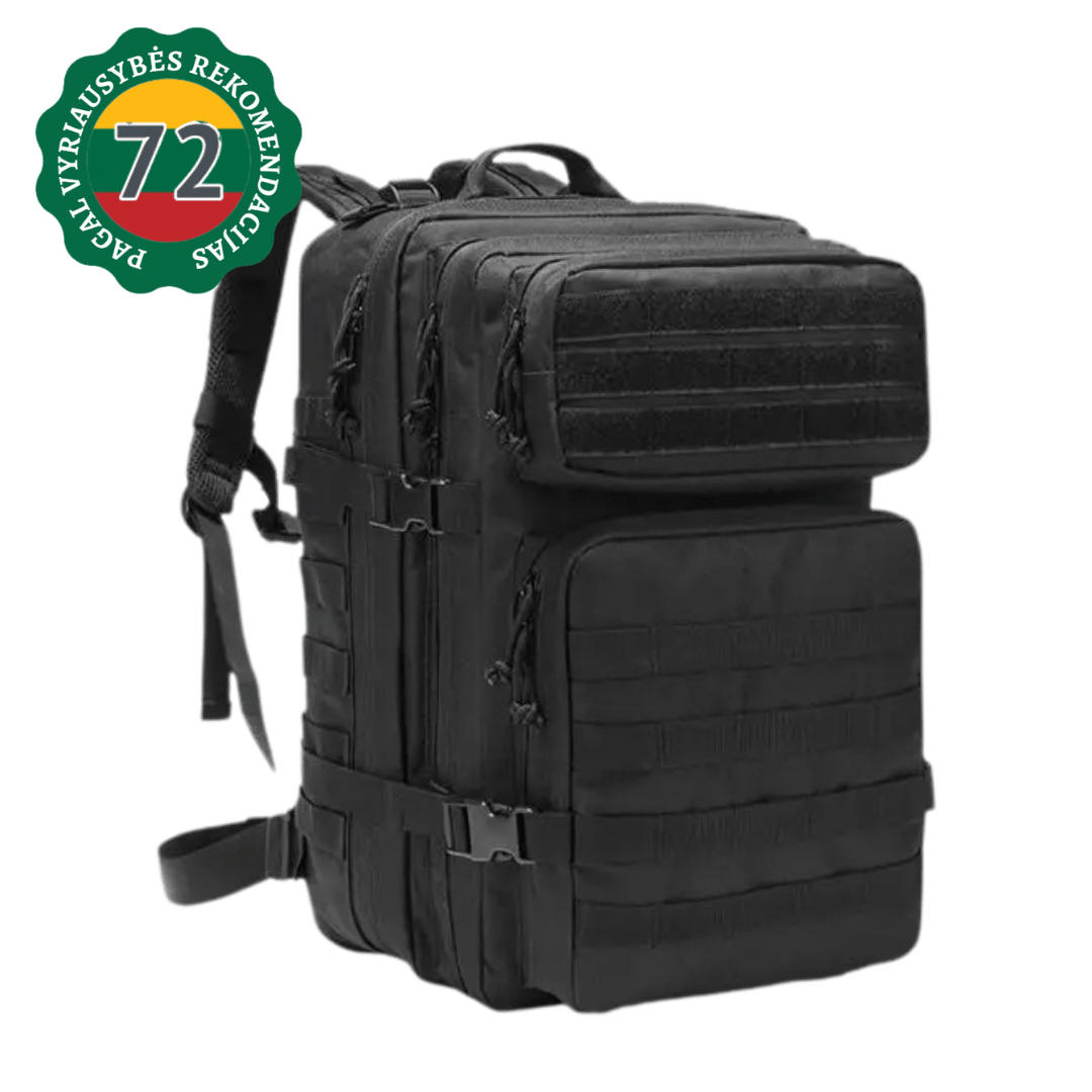 Taktinė kuprinė, pagaminta iš patvaraus „Oxford“ audinio, skirta intensyviam naudojimui lauke – tiek išgyvenimo situacijose, tiek žygiuose ar stovyklose. 45 litrų talpa užtikrina pakankamai vietos būtiniausiems daiktams, o kompaktiški matmenys leidžia lengvai nešiotis net ir pilnai prikrautą.